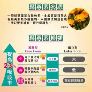 1.最高單位葉黃素-因為原料非常昂貴,市面上幾乎都只含6或15毫克,我們增量添加一顆就有30mg,也是最高等級游離型的葉黃素,吸收效果更勝市面酯化型,吸收度最好
